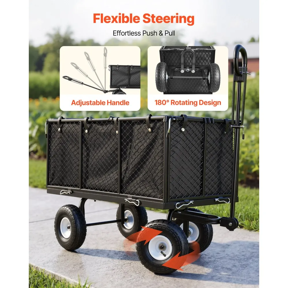 Reguleeritav käepide võimaldab hõlpsat manööverdamist, samas kui eemaldatavad külgpaneelid lihtsustavad laadimist ja mahalaadimist. See käru on praktiline lahendus suurte aiatööde jaoks, kus on vaja vedada mulda, taimi või tööriistu.