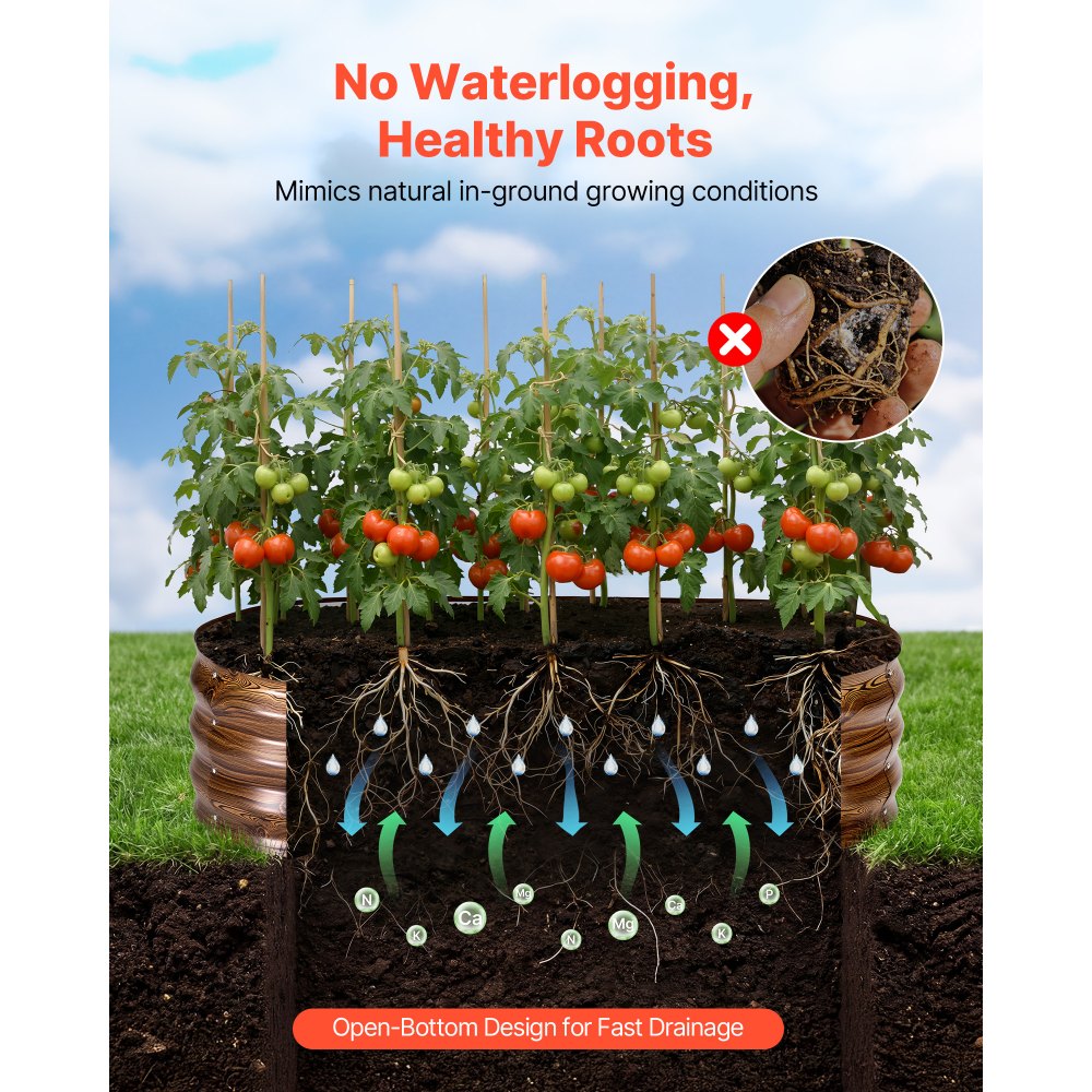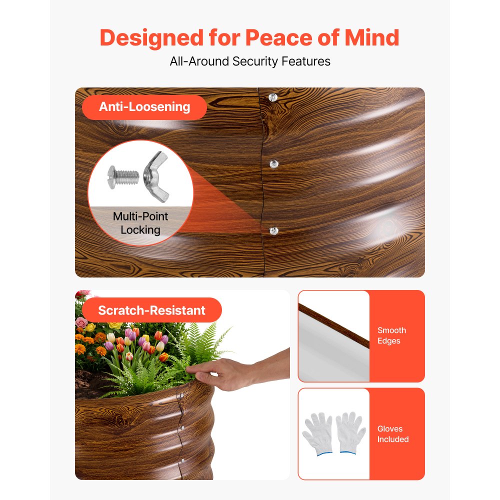 Ovaalne disain ja sügav puidusüü muster lisavad aiapeenrale esteetilist väärtust. Lihtne paigaldus ja vastupidav materjal teevad sellest praktilise valiku igale aiandushuvilisele. praktiline lahendus lillede ja köögiviljade kasvatamiseks.
