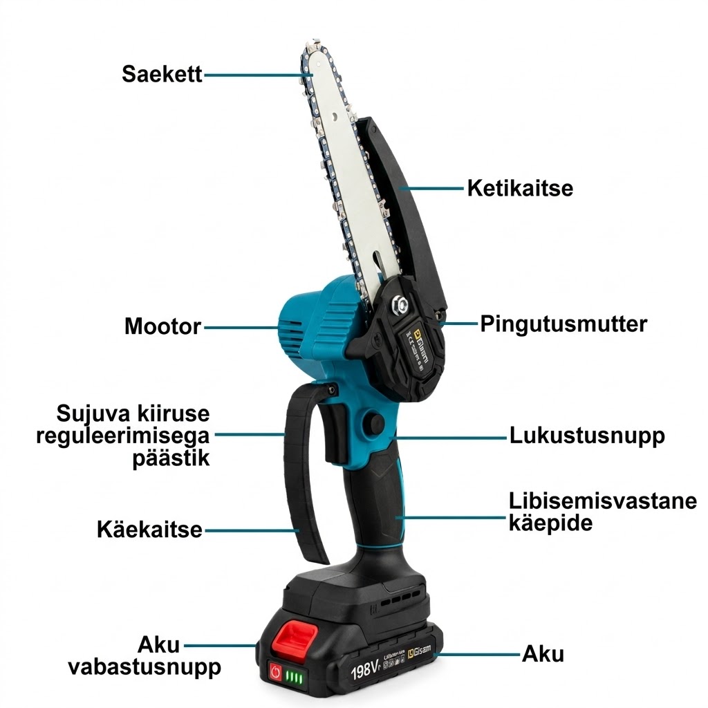 Tänu harjavabale mootorile saavutab see suurema jõudluse ja pikema eluea. Reguleeritav kett, ning libisemiskindel käepide tagavad sujuva ja turvalise töö.