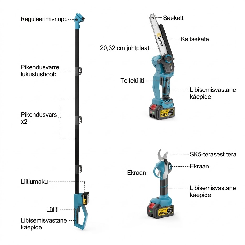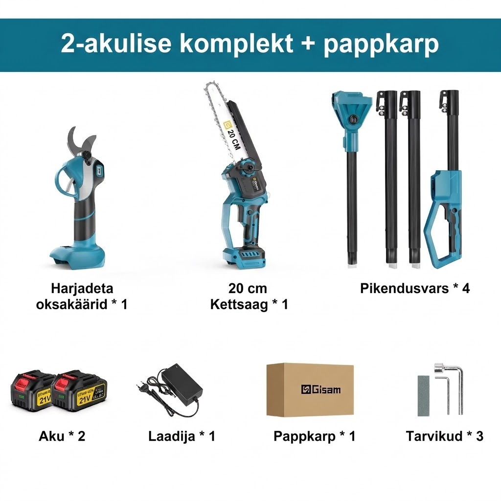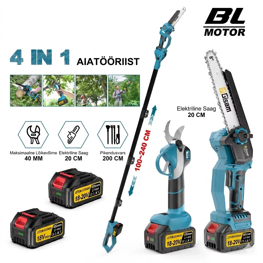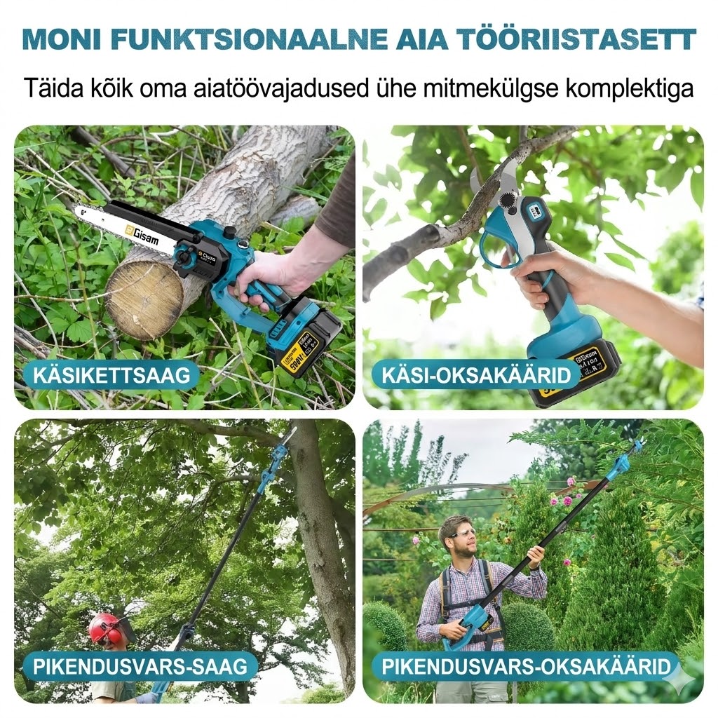 Gisam 4-in-1 akutoitel oksalõikur on professionaalne ja mitmekülgne lahendus aia- ja metsahoolduseks. Komplekt sisaldab teleskoopvarrega kettsaagi ja elektrilisi oksakääre, mis võimaldavad lõigata nii kõrgeid oksi kui ka pakse harusid ilma redelit kasutamata.