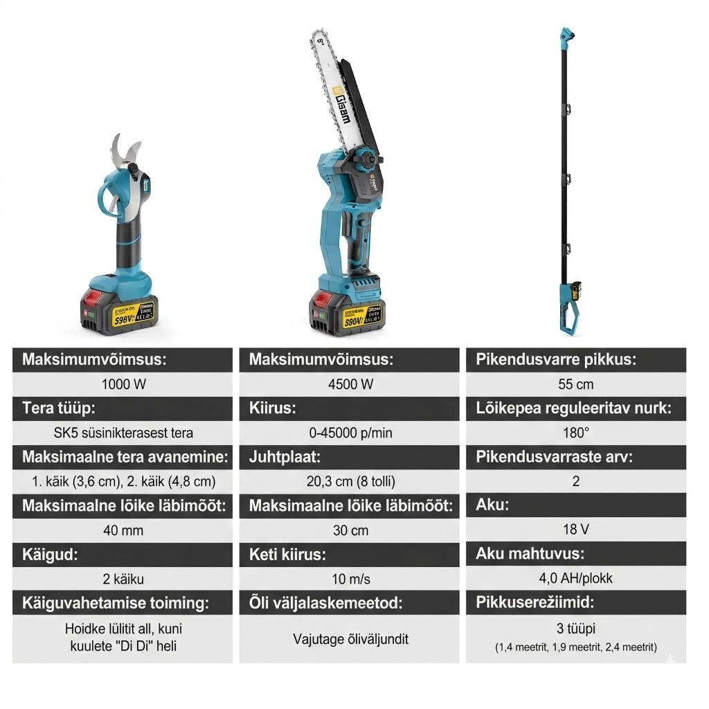 Võimsus: kuni 1000 W (kääridele) / 4500 W (kettsaele)