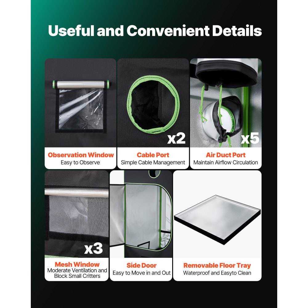 Vastupidav 600D Oxford kangas tagab telgi pikaealisuse ja valguse blokeerimise. Tugev metallraam ja stabiilsed nurgakinnitused võimaldavad tööriistavaba paigaldust. praktiline lahendus lillede, puuviljade, ürtide ja köögiviljade kasvatamiseks.