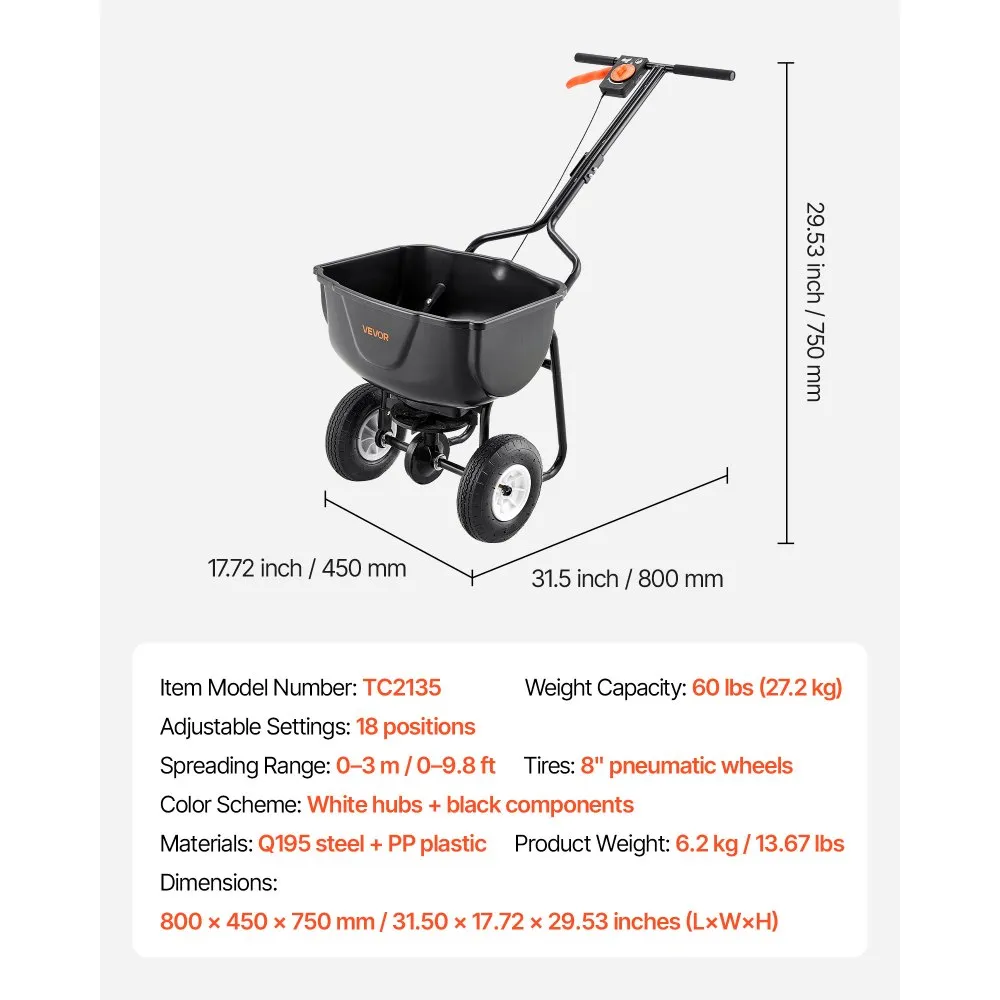 27,2 kg kandevõime ja 20,3 cm maastikurehvid tagavad stabiilsuse ja lihtsa liikumise igal maastikul. See on praktiline lahendus väiksematele aladele, kus on vaja täpset ja ühtlast levitamist.