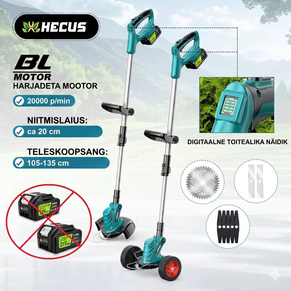 HECUS akutoitega murutrimmer on võimas ja vastupidav tööriist muru niitmiseks, umbrohu eemaldamiseks ning põõsaste hooldamiseks. Seadmel on harjavaba mootor, mis tagab sujuvama töö, väiksema kulumise ning pikema kasutusea.