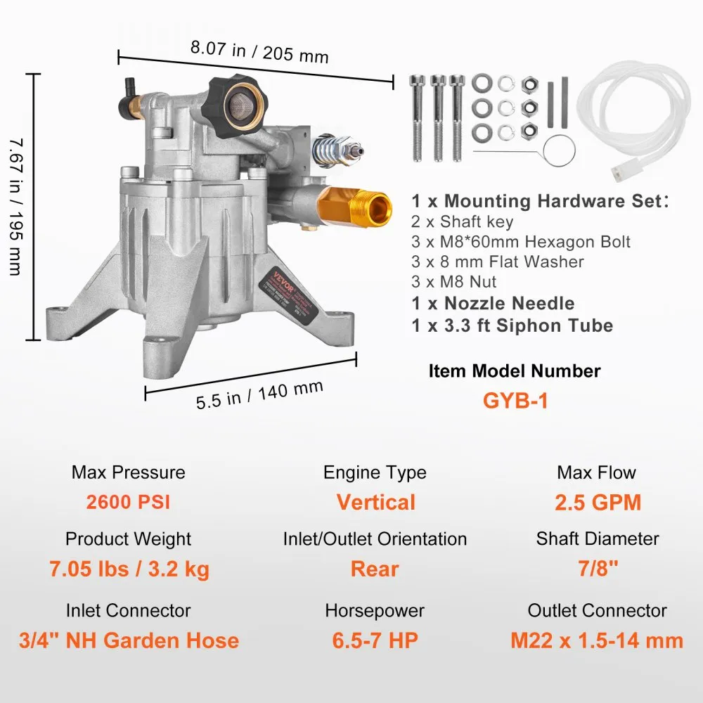 Vertikaalne survepesuri pump on praktiline lahendus, kui otsite vastupidavat asenduspumpa oma survepesurile. Sellel on 179,1 bar maksimaalne rõhk ja 2,5 GPM vooluhulk, mis sobib hästi nii kodukasutajatele kui ka professionaalidele. Komplekt sisaldab kõike vajalikku kiireks paigalduseks.