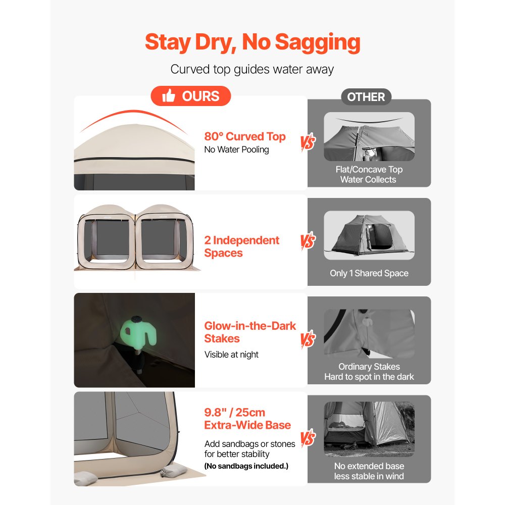 Mahutab kuni 10 inimest, see varjualune on ruumikas ja mugav. Sobib hästi pereüritusteks või sõpradega aja veetmiseks. Kerge ja kaasaskantav disain muudab selle ideaalseks lahenduseks igasugusteks välitegevusteks.