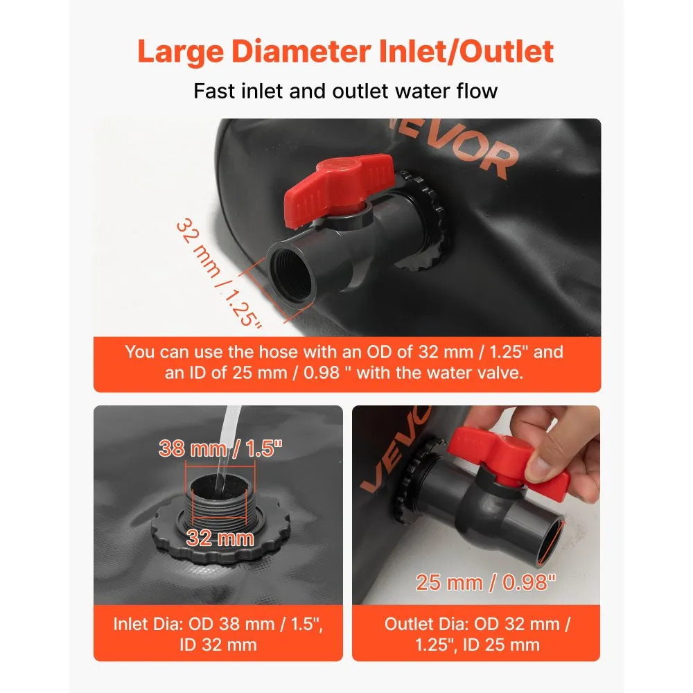 Kokkupandav disain muudab selle mahuti lihtsasti kaasaskantavaks, sobides seega hästi nii koduseks kui ka välitingimustes kasutamiseks. See on praktiline lahendus veemajandamiseks mitmesugustes olukordades, sealhulgas hädaolukordades. praktiline lahendus aianduseks, telkimiseks ja hädaolukordadeks.