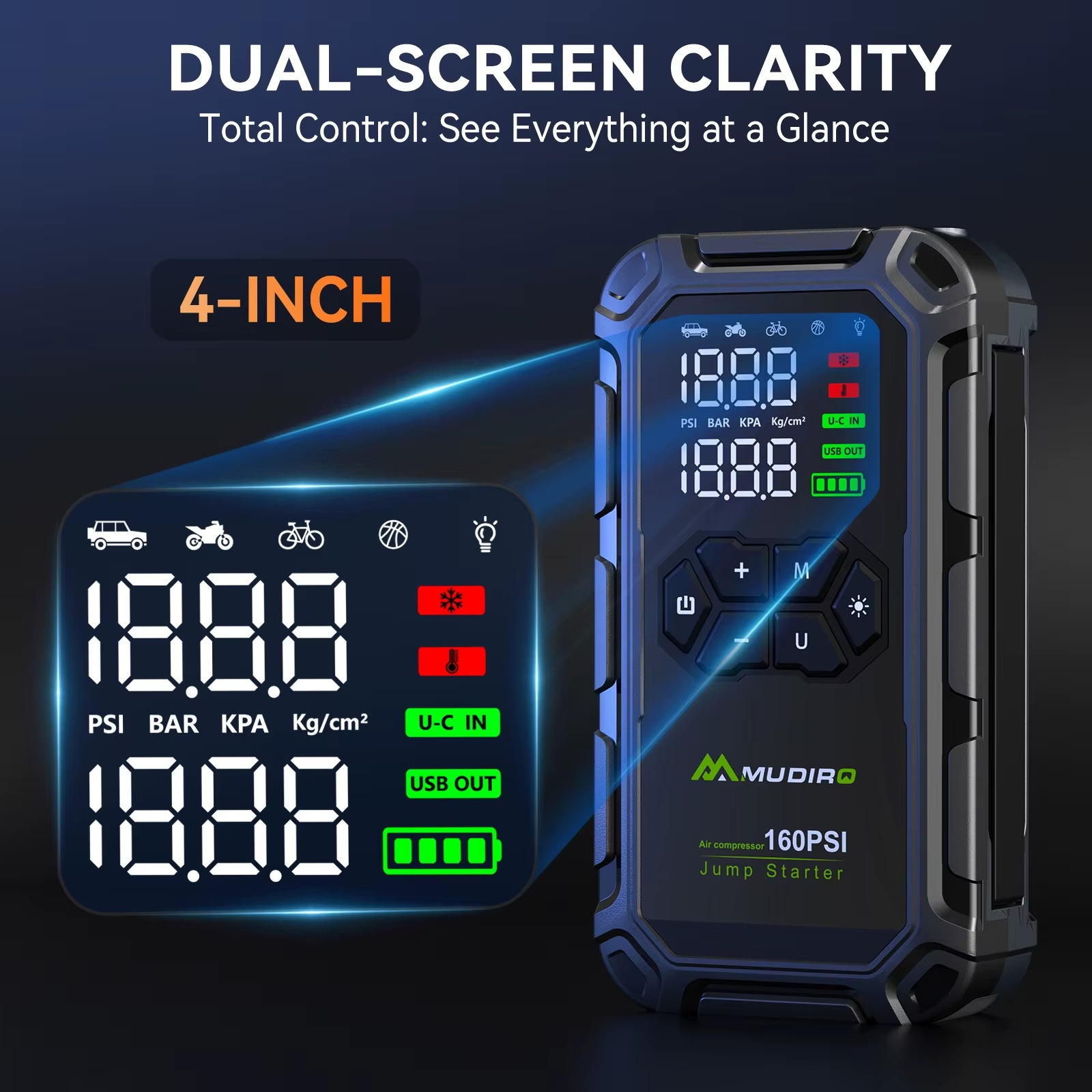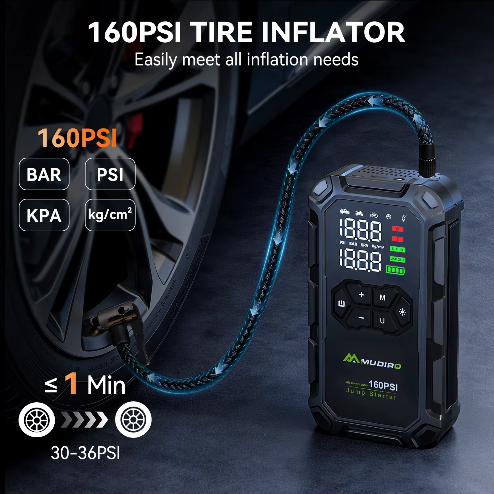 MUDIRO M-JA3 on kompaktne ja mitmeotstarbeline auto käivitusabi, mis ühendab endas võimsa 6000A tippvooluga käivitusseadme, akupanga ning sisseehitatud õhukompressori. Seade on mõeldud 12V sõidukitele ning sobib nii bensiinimootoritele kui ka kuni 8,0-liitristele diiselmootoritele.