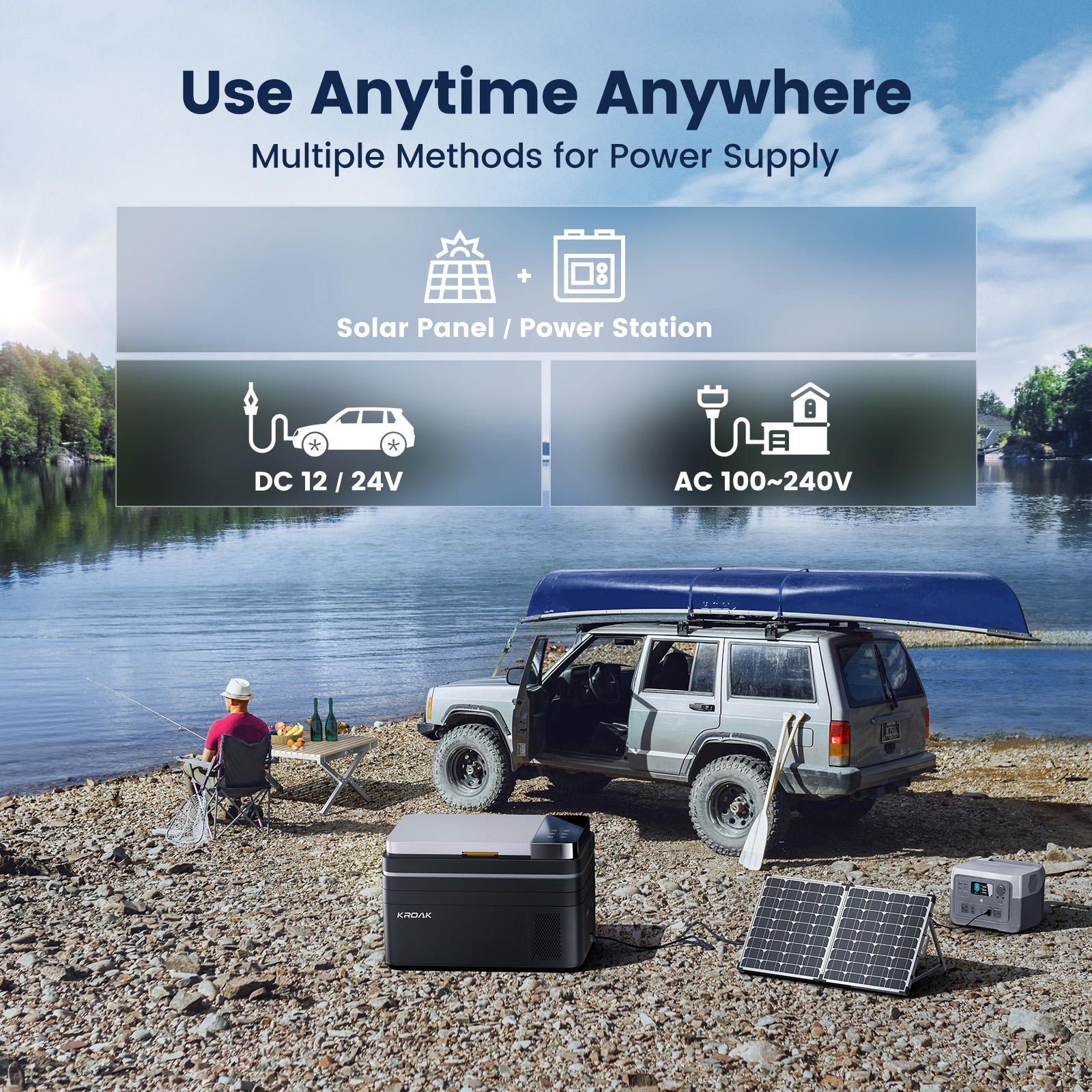 Külmik toetab MAX ja ECO režiime – kiireks jahutuseks või ökonoomseks pikemaks kasutuseks. Toide toimub nii 12/24V auto sigaretisüütaja kaudu kui ka 100-240V koduse vooluvõrguga, mis teeb selle äärmiselt paindlikuks igas kasutuskohas.