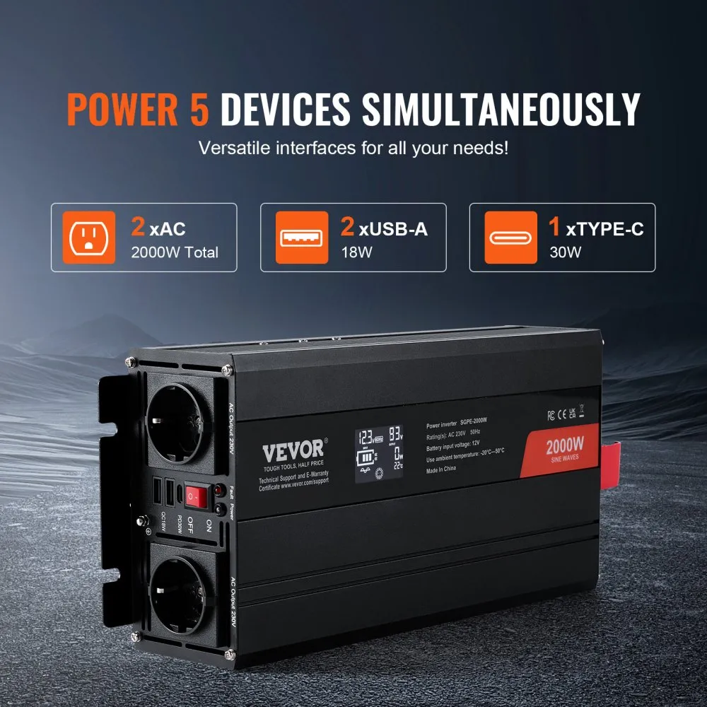 Puhas siinuslaine inverter on praktiline lahendus, et muuta 12V DC pinge stabiilseks 230V AC pingeks. 2000 W pidev võimsus sobib nii koduseks kasutamiseks kui ka väiksematele ettevõtetele. Komplektis on mitmed väljundid, mis võimaldavad laadida kuni 5 seadet korraga.