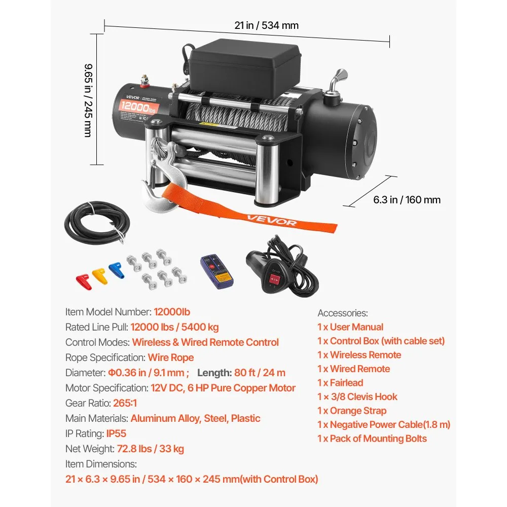 Elektriline Vints (5400 kg, 12V, 24 m Terastross, Juhtmevaba ja Juhtmega Pult)