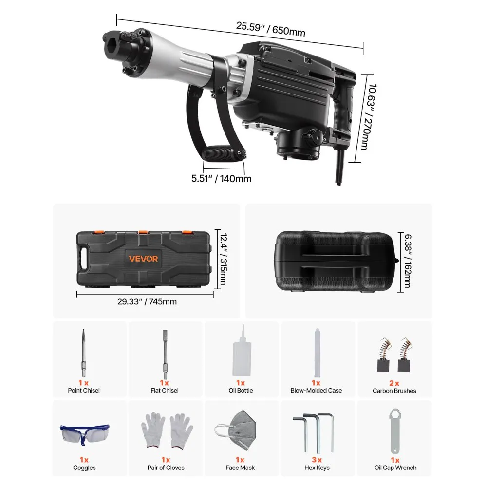 See vastupidav elektriline lammutusvasar on sobiv betooni, seina ja telliste purustamiseks. Komplektis on kõik vajalikud tarvikud.
