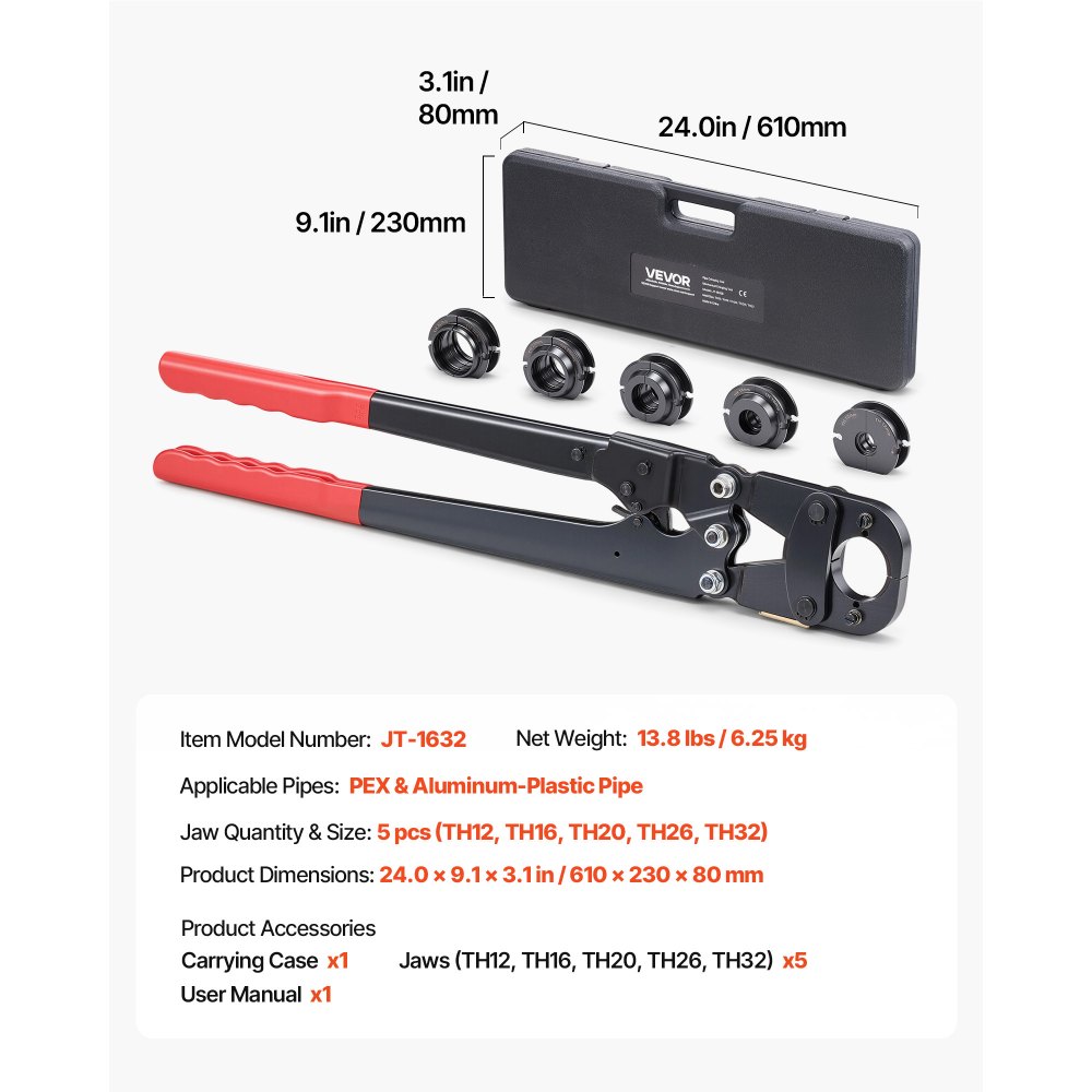 Torupressikomplekt PEX ja alumiinium-plasttorudele on sobiv tööriist erinevate torude pressimiseks. Sellel on 5 vahetatavat lõuapaar, mis sobivad erineva suurusega torudele. Painduv käepide ja kompaktne disain muudavad tööriista kasutamise mugavaks ka kitsastes kohtades. Komplekt sisaldab ka vastupidavat kandekohvrit, mis tagab tööriistade korrasoleku ja lihtsa transpordi.