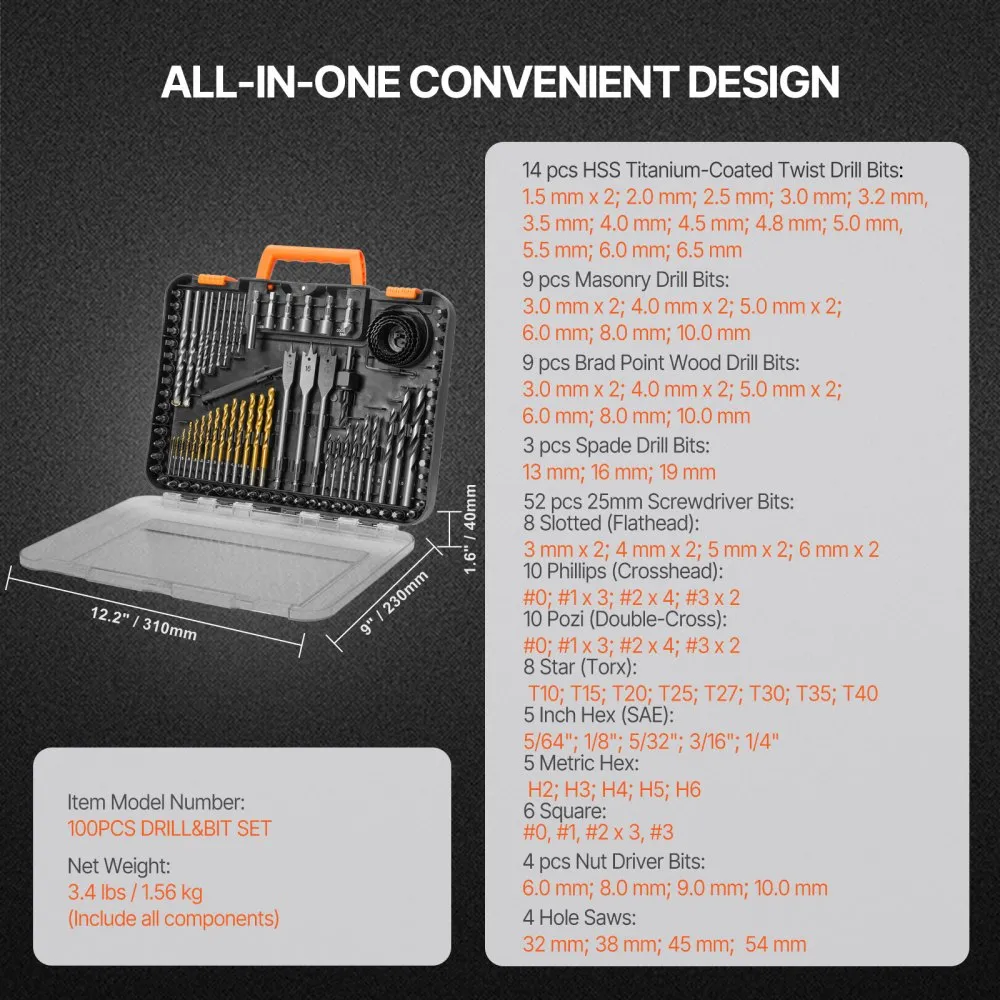 See vastupidav puuriterade komplekt on mitmekülgne ja sobib nii kodukasutajatele kui ka professionaalidele. Komplektis on 100 osa, mis hõlmavad erinevaid puuri- ja kruvikeeraja otsikuid.
