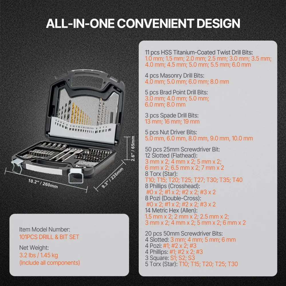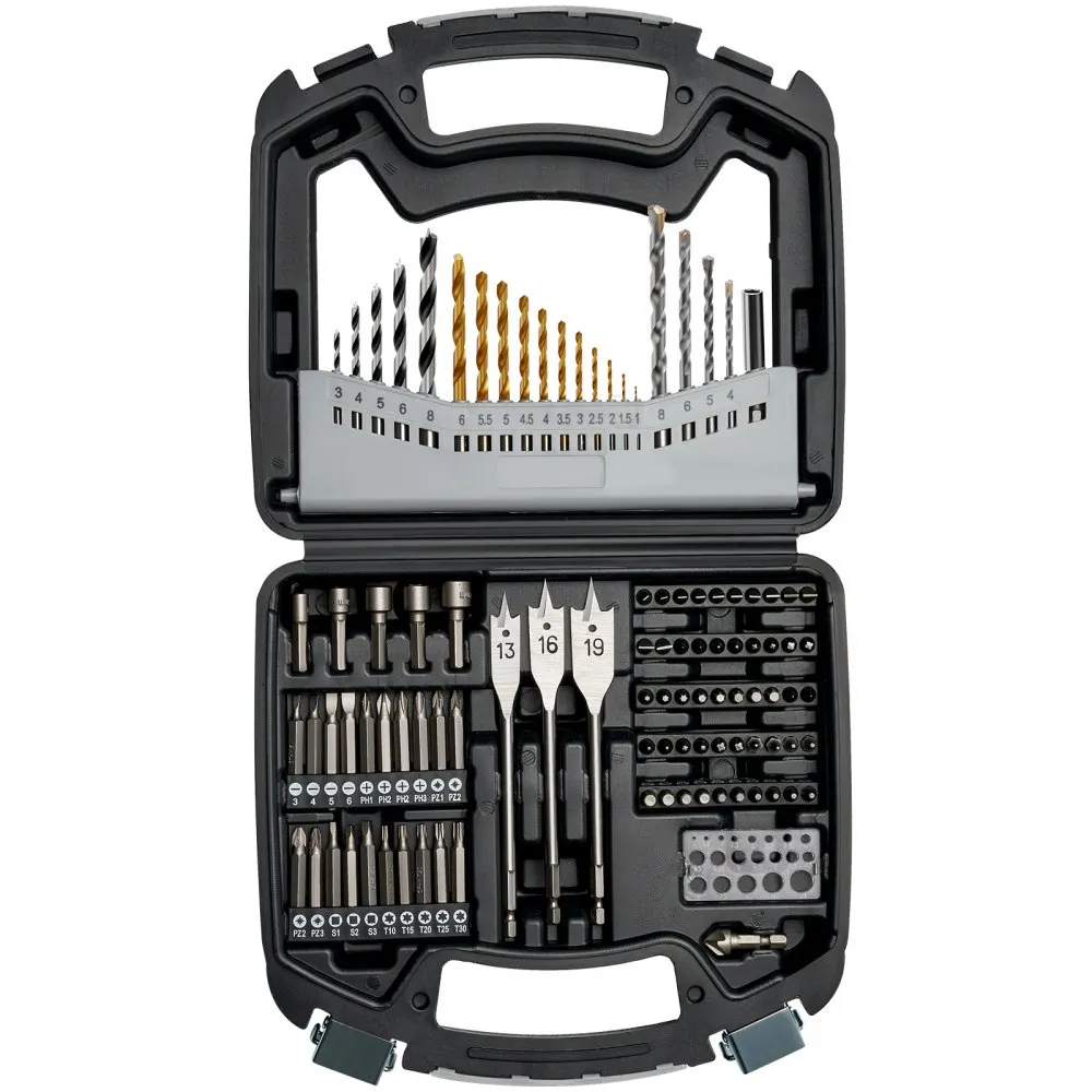 See vastupidav puuriterade komplekt on mitmekülgne ja sobib nii kodukasutajale kui ka professionaalile. Komplektis on 101 osa, mis hõlmavad erinevaid puur- ja kruvikeeraja otsikuid.