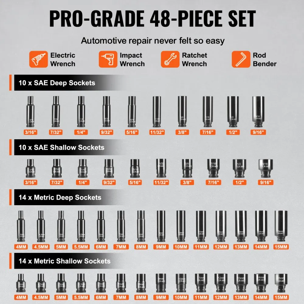 1/4-tollise ajamiga lööktopsikomplekt (48 osa, 0,5 cm-1,4 cm SAE, 4–15 mm meetriline)